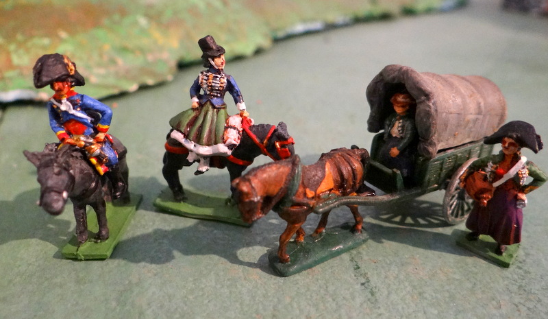 Vivandières : minifigs (la plus petite, Warmodelling les grandes). A noter un chirurgien sur son âne (warmodelling également) – la tête est particulièrement vilaine, les vivandières sont peu avenantes.