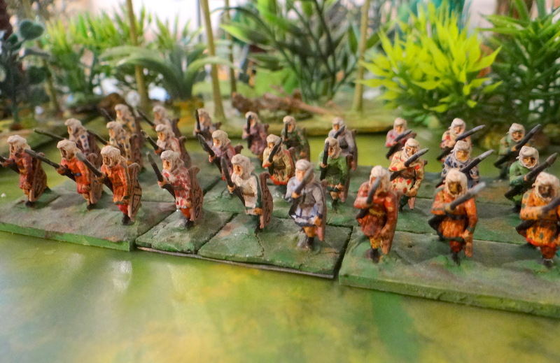 Les 10 000 immortels (lance, arc sur l’épaule) ici en tenue de palais, en campagne il est probable que leur tenue se rapprochait plutôt des Iraniens de la photo suivante). A noter qu’ils portaient une cuirasse sous leurs robes. Figurines 15 mm Minifigs.