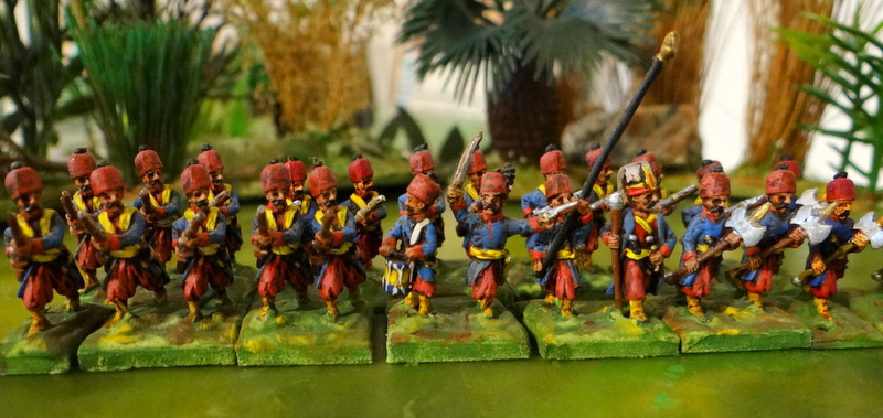 Ce sont les troupes les plus connues. Épine dorsale de l’armée, les janissaires sont à l’origine des esclaves capturés lors des guerres du sultan. A l’époque napoléonienne l’empire ottoman comptait 196 ortas de janissaires (entre 2 et 3 000 hommes chacune -bonjour la précision). Devenus arrogants et incontrôlables, le sultan Sélim voulut réduire les 60 000 janissaires de moitié. Mal lui en pris, ceux ci l’assassinèrent en 1807. Son successeur Mahmud II prit des gants pour réduire leur pouvoir. Les janissaires disparurent en 1826.