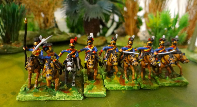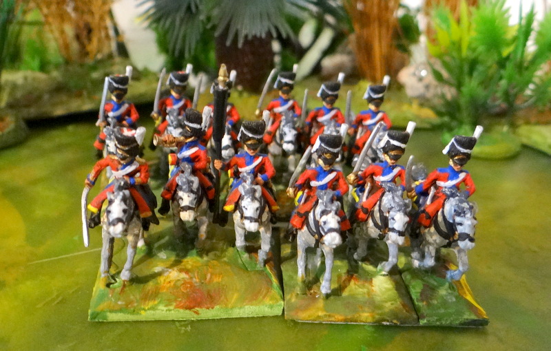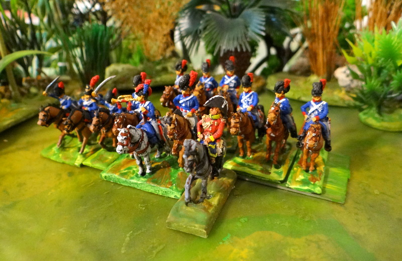 Dragons légers en shakos. Pour cette unité, l’uniforme précédent ressemblait à celui des hussards ci dessus mais la flamme du bonnet était à gauche.