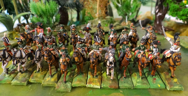 C’était avant que je ne termine une belle unité de uhlans Old Glory qui traînait dans mes tiroirs depuis 10 ans…. si, si ! Je peux donc mettre en ligne maintenant 24 uhlans d’Orembourg (col et chapska framboise, boutons et épaulettes jaunes) en tenue 1808.