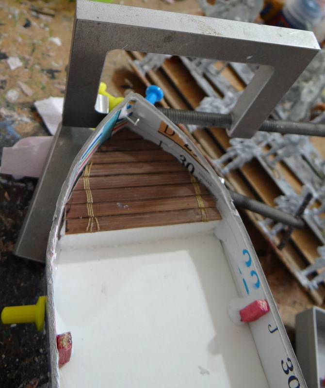Comment refermer la proue ?: 2 punaises à tête et 2 serre-joints. Plancher à base de couvercle de boite de chocolats.