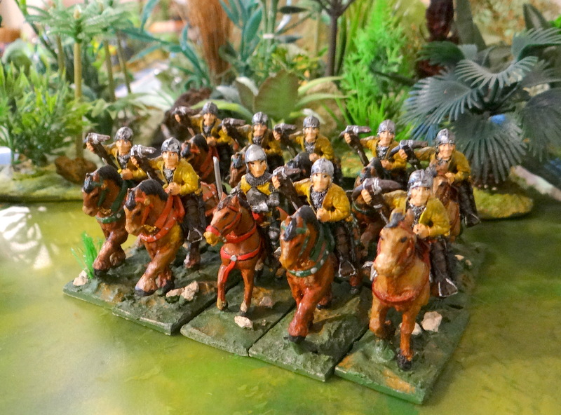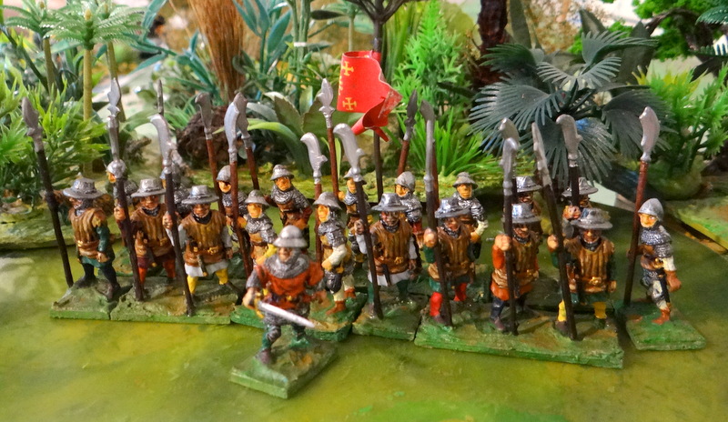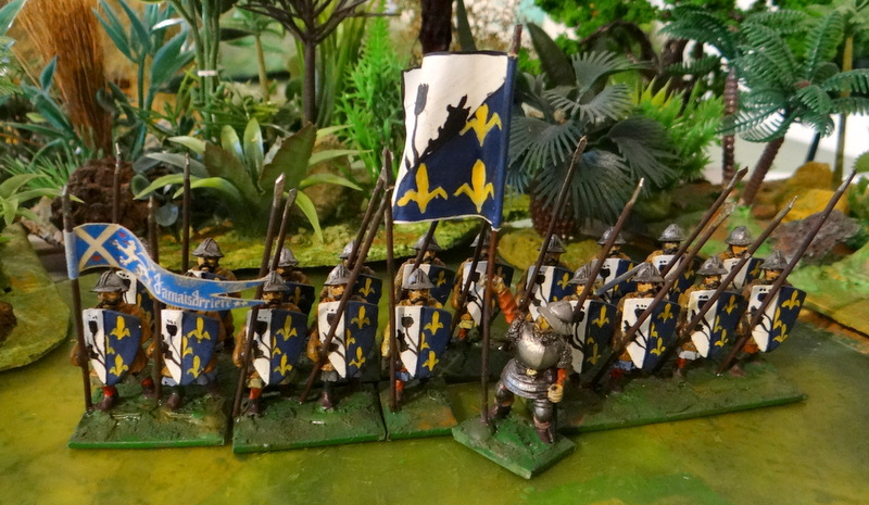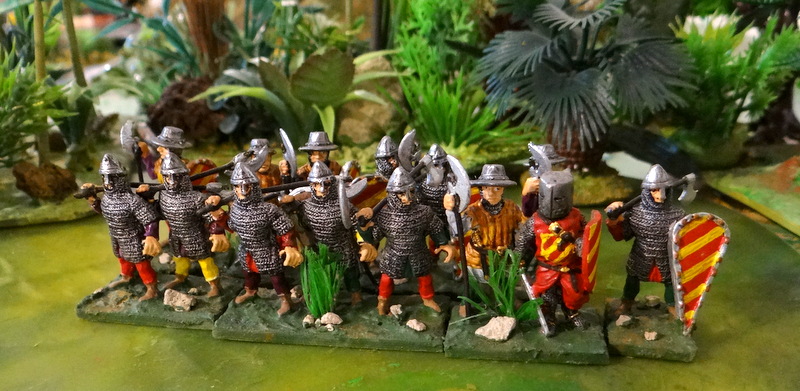 La firme existe toujours (www.essexminiatures.co.uk) . J’ai cependant relevé 2 défauts. Premièrement, à un moment donné, un nouveau graveur est intervenu en produisant des figurines plus fluettes et vraiment sans rapport avec le style précédent. Les argyraspides (lance haute) et les sorties connexes par exemple sont à rejeter. Deuxièmement, la gamme offre très très peu voire pas de variantes ce qui n’est plus au goût du jour. Ce n’était pas un handicap à l’époque, en effet, le déploiement sur la table d’unités bien « carrées » était de rigueur. Exemples avec ces médiévaux tardifs (années 1300 bien mures):