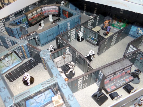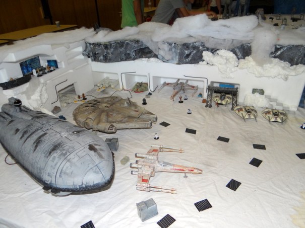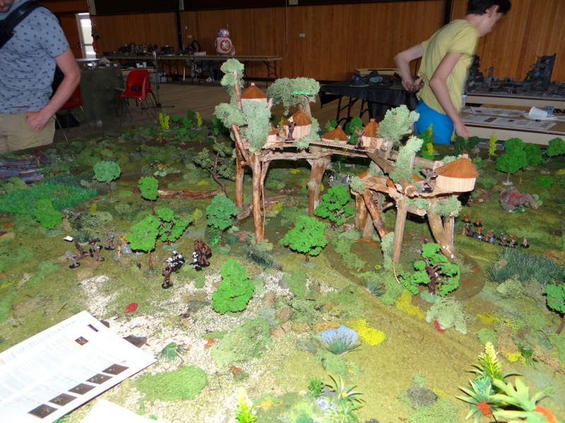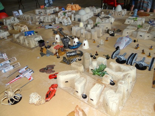 D’accord je n’ai pas fait un gros effort étant donné que Trélissac (24) est sur ma route mais je pense qu’il était bon de s’arrêter pour soutenir quelques « fanas » de figurines et de jeux sur table.Sur place, la salle est grande et trois méga-table Star Wars en occupent une grande partie. Pour la circonstance Phil et ses soutiens alignent une table « Hott » , une table « Tatoine » et une table « de la lune forestière » chère aux Ewoks . Un destroyer interstellaire démontable parcours même la salle. De passage en plein après midi, plus de personnages grandeur nature, les derniers ont fini cuits à point m’a-t-on dit. IL faut dire que le thermomètre affiche un bon 34°en cet après midi. Quatre autres tables proposent soit d’autres scénarios Star Wars soit une rencontre de vaisseaux interstellaires.