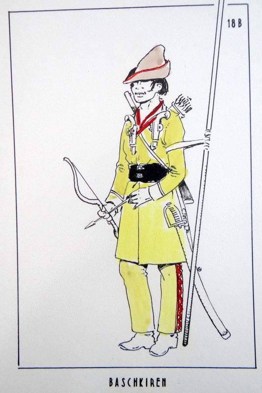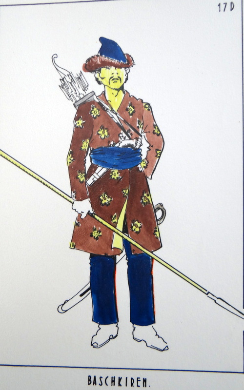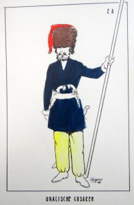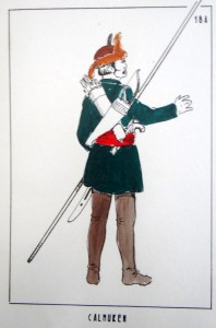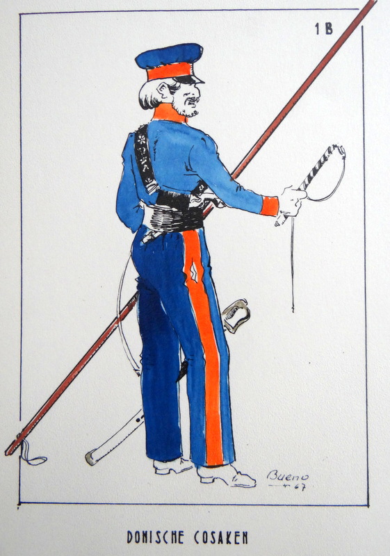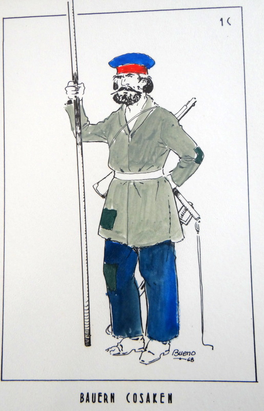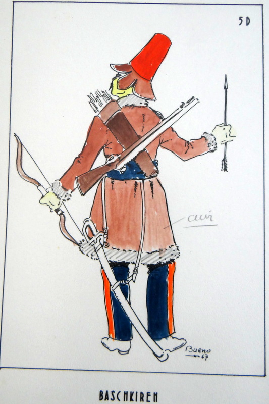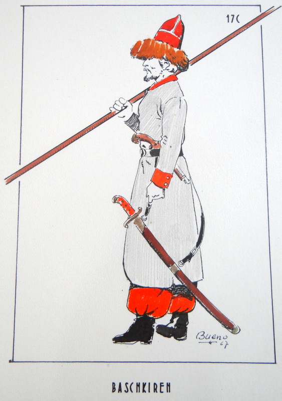 Je reviens sur les cosaques à l’occasion de la mise en peinture d’une sotnia (escadron d’une centaine d’hommes) rescapée de mes placards. Les plus vieilles peuplades cosaques connues remontent au XIV éme siècle. Leur histoire est riche en soubresauts, révoltes et quasi génocides. La période qui m’intéresse est l’ère napoléonienne. Voyons les infos disponibles dans le manuscrit d’ Elberfeld que j’ai déjà évoqué dans un de mes posts précédents. Il y avait bien chez les cosaques des prescriptions particulières concernant la tenue vestimentaire. Cependant elles ne pouvaient pas être respectées compte tenu de l’organisation particulière de ces troupes. Seuls les cosaques de la garde et quelques officiers étaient habillés selon le règlement. C’est pourquoi les dessins de cette époque offrent un intérêt certain. Kalmouks et Bakchirs sont également présentés dans ce post.