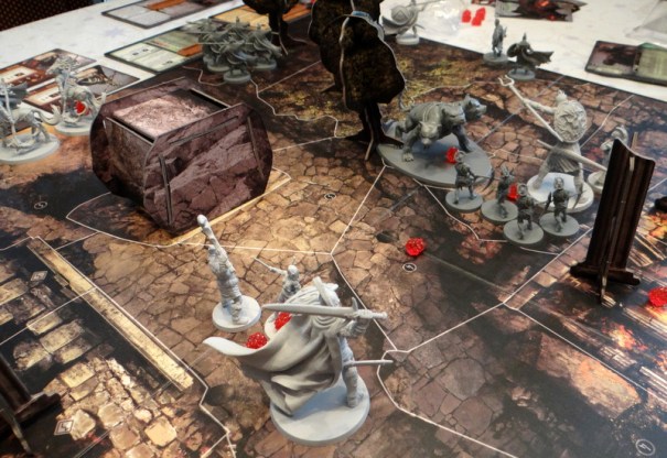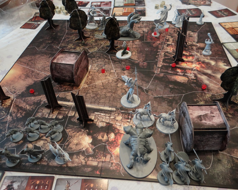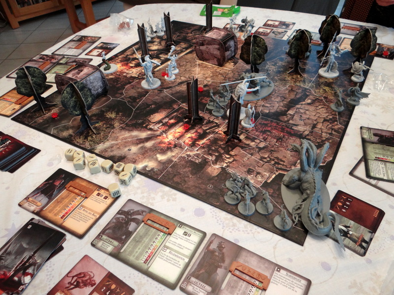 La mise en place du jeu est assez rapide, les décors fournis pas la boite ne sont pas terribles à mon sens, passons pour les colonnes mais les arbres et les rochers bof ! Les fiches sont claires et les tours de jeu pas prise de tête. Ce serait même trop simple pour y voir l’intervention des dieux. Ils ont bien baissé les pauvres ! Sinon les enchaînements sont cools.