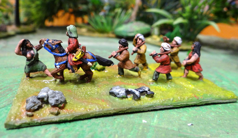 Revenue du fond d’une boite oubliée, j’ai également mis la dernière main à une scénette 15 mm gravée et produite par Alain Touller du temps où il habitait Gradignan. Il s’agit d’un convoi de prisonniers dans les steppes de l’est mené par un guerrier mongole ou Hun ou même Scythe. Alain produisait aussi une autre scène de la même époque : un chariots couvert de peaux avec une famille comme équipage.