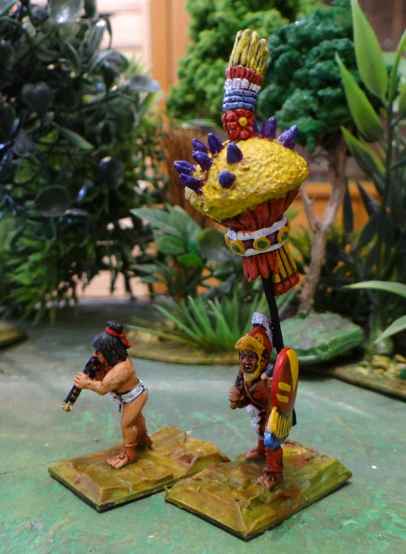 Un capitaine aztèque et son musicien. Ce n’est pas un bouquet de Saint Valentin qu’il porte sur le dos mais un « étendard » disant qu’il a déjà capturé 5 ou 6 ennemis.