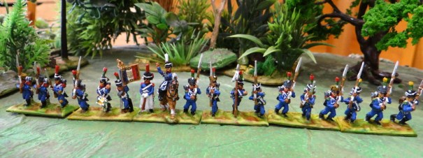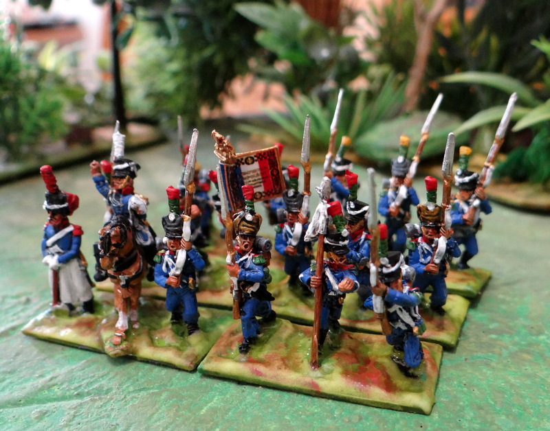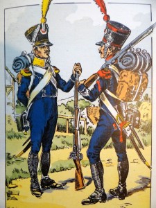 Je viens de mettre en couleur de vieilles figurines 15 mm. La légère porte l’habit et le pantalon bleus dit bleu impérial, les sapeurs et les musiciens peuvent être plus colorés : verts, rouges .. . Mes figurines , des old glory semble-t-il, sont plus dépenaillées que celles de la gravure de l’excellent Boisselier (chaussures craquées, pièces sur l’uniforme, pantalons déchirés, c’est à dire les variantes habituelles de la marque qui n’est pas à une pose improbable prés) ) . De plus elles portent l’uniforme 1808 (1812 sur la gravure, on voit leur habit veste carré sur le devant). Faute d’une puissante loupe, vous me direz que le détail n’est pas frappant ! A noter que là encore, les règlements uniformologiques étaient souvent « aménagés », pour le moins (ex : plumets ou pompons, bonnets à poils pour les carabiniers ou shakos, guêtres ou pantalons divers etc..)