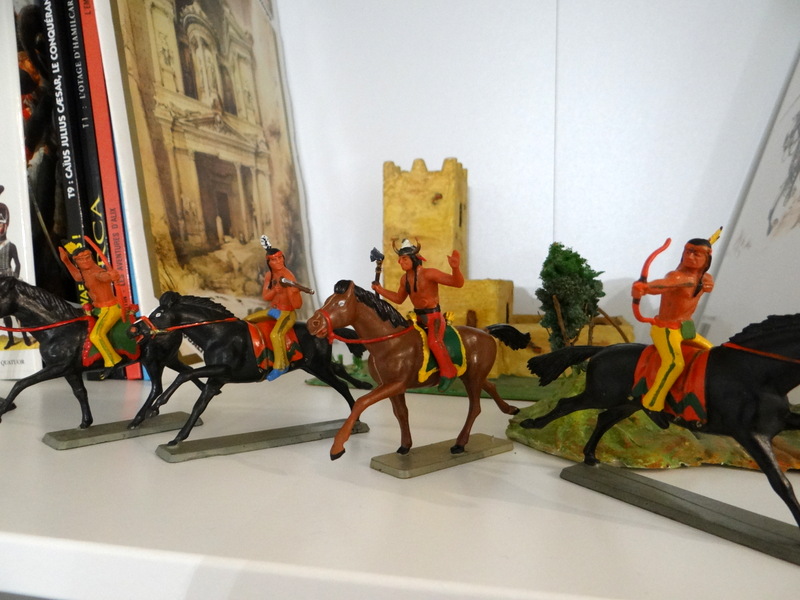 Et pour les toujours jeunes nés dans les années 50, voilà quelques indiens Starlux, la marque de ma jeunesse que j’ai fini par réparer. Queues et pattes des chevaux refaites, arcs, plumes et tomahawk réparés.