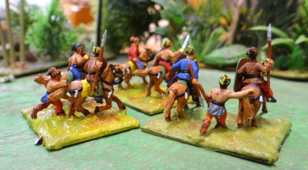 J’ai retrouvé dans mes stocks des Germains 15mm gravés par Alain Touller. On reconnait bien la patte du graveur aux chevaux genre « Przewalski » qu’il produisait. Un genre de cheval mongol doté d’une grosse tête. Particularité, Alain avait sorti une gamme « guerre des Gaules » incluant des cavaliers germains soutenus par de jeunes guerriers à pied. César nous dit qu’ils se cramponnaient à la queue des chevaux pour arriver au combat plus vite et soutenir leurs frères cavaliers qui étaient des guerriers plus aguerris. Je suis peut être le seul à en posséder !