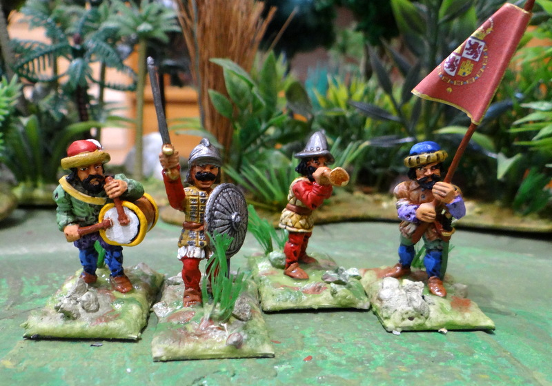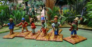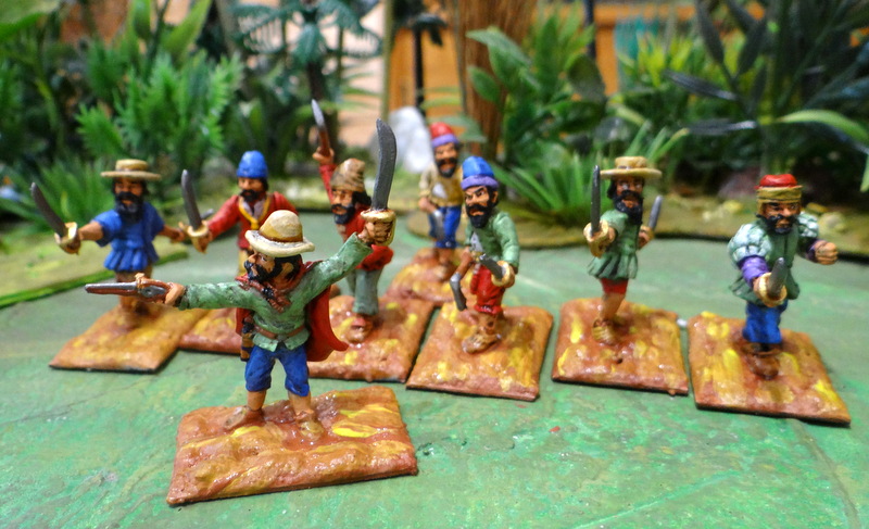 Les marins de Cortès. J’ai traité leurs socles en « maronnasse » car, vu leurs trognes, je peux les assimiler à des pirates afin de meubler le bâtiment que j’ai fabriqué durant ma convalo. Du gazon sur le rafiot ça ne le ferait pas !
