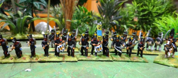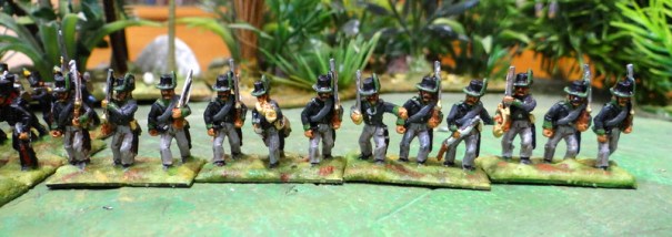 Toujours aussi noirs (ils portent le deuil de leur pays cf au souhait de leur duc). Avec les reliquats de figurines CGM, j’ai réussi à aligner le premier bataillon du 1er de ligne en 1815. A noter que seuls les régiments d’infanterie de ligne avaient un drapeau.