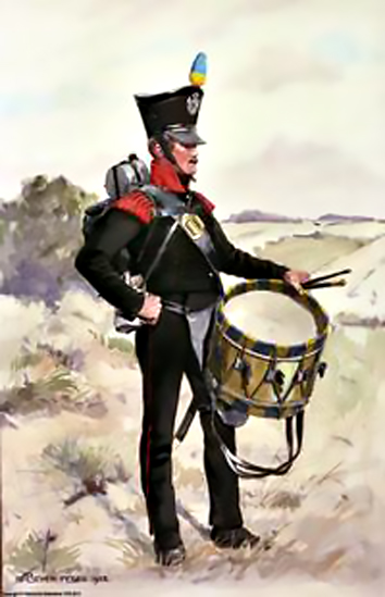 Un bataillon de chasseurs armés de carabines et non de fusils. Il s’agit du bataillon dit « des chasseurs gris » à cause de leur uniforme gris foncé. Les autres régiments de chasseurs ont un habit gris clair.