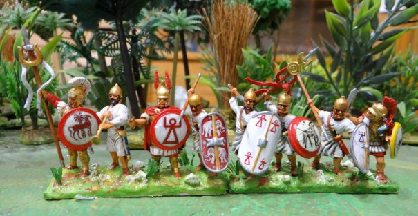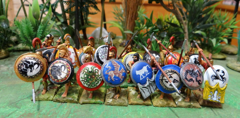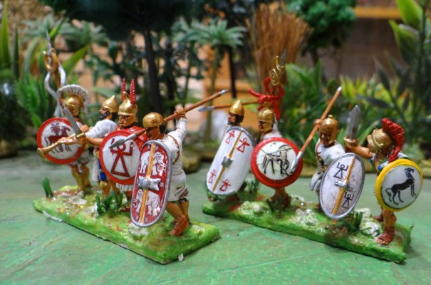 Voilà des Grecs de marque « immortels miniatures ». Je n’aime pas trop leurs petites têtes et les transferts pour leurs boucliers sont impossibles à réussir correctement.