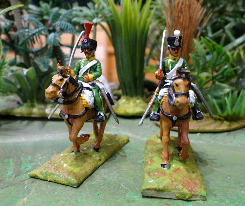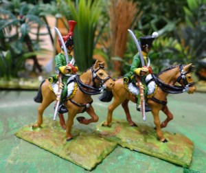 Les modèles sont légèrement plus petits que les Victrix mais s’agissant de chasseurs, les montures étaient plus petites que celles de la cavalerie de ligne. Curieusement, une sabretache est jointe au sabre ce qui fait très hussard. Il faudra que je cherche si c’est historique ? De même, il manque un bout du harnachement des chevaux avec breloque au niveau du cou mais bon !