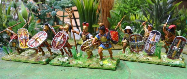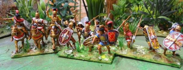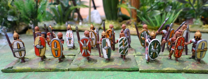 La première colonie de Carthage, Carthagène se trouvait en Espagne. Les celtibères de l’intérieur de l’Espagne et les Ibères du sud ont fourni de gros contingents de mercenaires aux troupes carthaginoises durant toute la période « de vie » de la citée libyo-phénicienne : De l’infanterie moyenne/lourde (suivant les règles), les Scutarii (portant le scutum comme bouclier). Ils sont armés de lances de divers modèles et de d’une épée « falcata » (un genre de machette) ou ibère droite. Puis des légers, les Caetratii (également d’après le nom de leur bouclier : caetra). Ils sont armés de javelots (des as de l’embuscade dit-on) . Enfin l’Espagne a également fourni de la cavalerie moyenne/lourde (pour l’époque). Cette cavalerie est relativement performante car habituée aux terrains difficiles. Elle aura le dessus face aux cavaliers romains mais elle reste fragile face à l’infanterie lourde. Toutes ces troupes donnent l’occasion à LBM, le fabriquant de décalcos pour boucliers, de se défoncer.