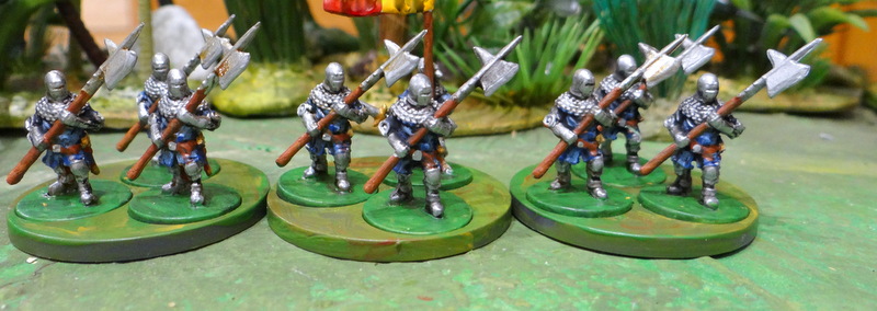 Les unités se présentent de cette façon : 3 fantassins par socle rond et de 2 à 10 socles par type unité. Les hallebardiers proposés sont de 2 types. On retrouve aussi des vougiers, des piquiers de 3 nationalités, des archers, des sergents d’arme, des guisarmiers, des arbalétriers, 3 sortes de chevaliers démontés et 3 sortes de paysans/milices armés.