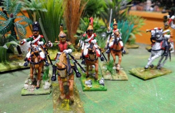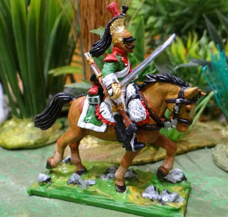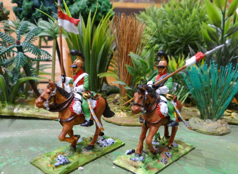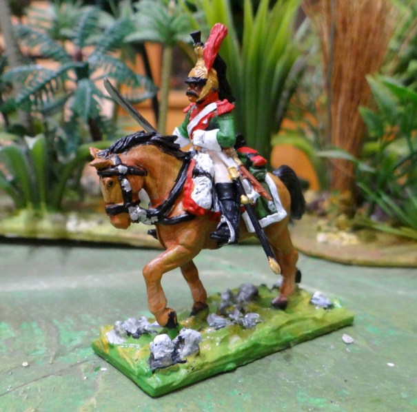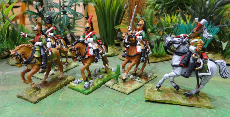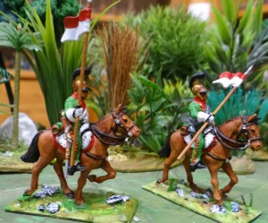 D’abord les lanciers. Ceux ci sont « de la ligne », du 1 er ou 6 éme lanciers si l’on en croit les couleurs, rouge écarlate pour le 1 er et garance pour le 6 eme, des rouges quoi ! Le numéro du régiment était porté sur les médaillons de front et de poitrail du cheval. Sur ces modèles le harnachement n’est pas totalement réglementaire, semble-t-il, on n’a pas de brides croisées sur le front des chevaux un oubli ou une erreur du graveur de Warlords games !