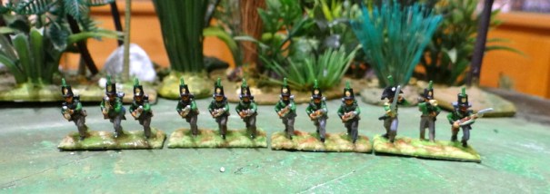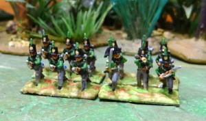 Un bataillon de jagers de la légion allemande à distinctives noires. A cette échelle j’ai recyclé des rifles d’autant qu’on ne voit pas les tresses des « dolmans », en effet les KGL portaient une veste sans brandebourg.