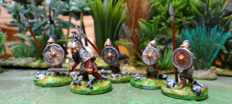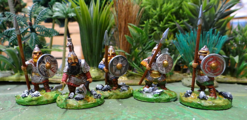 Voilà Gaston « côtes en long » et son équipe de gardes de la forteresse. Ma foi, pour des nains ils sont aussi grands que certaines figurines en 25 mm comme les Foundry. Trapus, ils donnent cependant une bonne image de nains tolkieniques. Je suppose que leur taille est en rapport avec celle des autres ethnies de la série (gnomes, gobelins, elfes etc .)