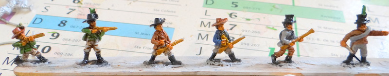 Encore plus fort. Voilà des partisans Andreas Hofer 15 mm produits par A Touller. Je pense que je suis à peu prés le seul à en posséder. Ils sont très petits et certains ont des attitudes vraiment improbables avec des pattes courtes. Je les colorise quand même ! Même si je n’ai pas de quoi monter une équipe insurrectionnelle avec ces 6 gus, ils pourront toujours renforcer mes guérilleros espagnols qui sont à la même échelle.