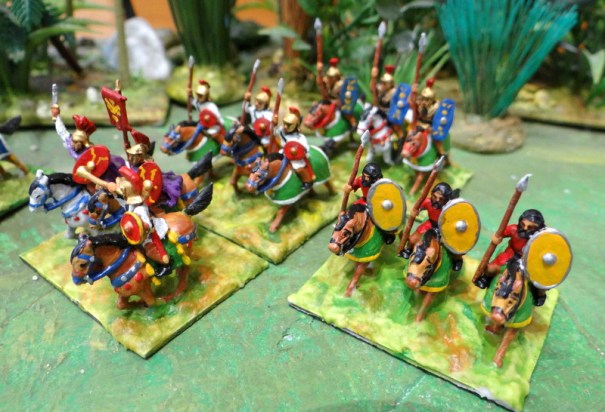 Il s’agit de Romains bas empire. Cavalerie lourde avec cuirasse et lance, moyenne en tunique et javelot et alliée barbare javelot.