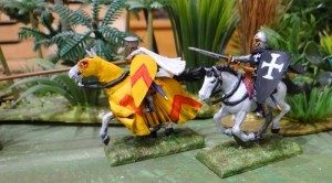D’or à chevron de gueule et croix hospitalière classique pour ces aventuriers médiévaux. Figs plastiques de chez Fireforge.
