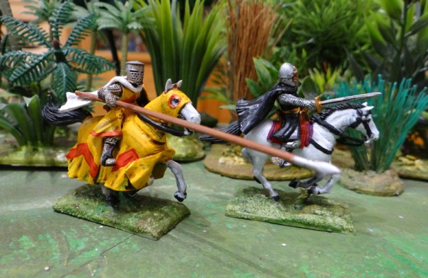 D’or à chevron de gueule et croix hospitalière classique pour ces aventuriers médiévaux. Figs plastiques de chez Fireforge.
