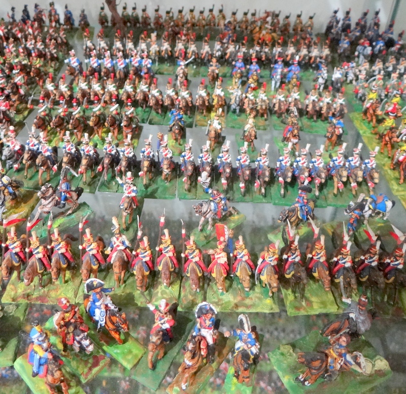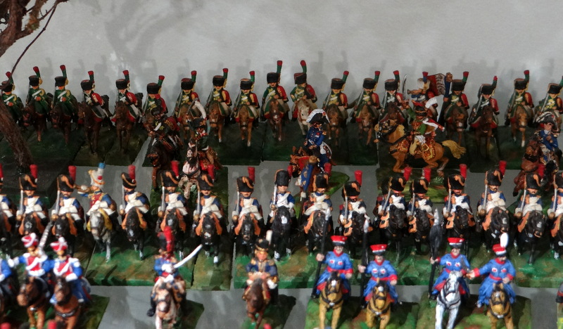 Voila la cavalerie de la garde presque au complet (5 régiments et leurs états-majors), il n’y manque que les lanciers de Berg et les tartares lithuaniens (cavaliers légers musulmans de Crimée rattachés plus ou moins au 1er lancier) qui y firent une apparition au cours de l’empire. On voit sur le cliché, à partir du fond : les chasseurs à cheval, les grenadiers à cheval puis les dragons de l’impératrice suivis du 1er et 2eme lanciers. Sur la gauche s’intercalent des escadrons de jeune garde : les éclaireurs chasseurs, éclaireurs dragons et lanciers. Les escadrons sont à 5 figurines au 40eme soit 200 sabres par escadron.