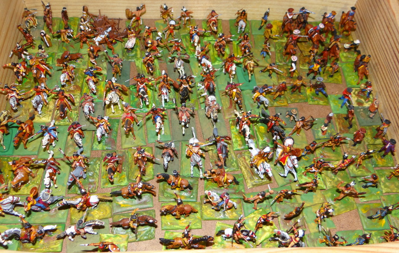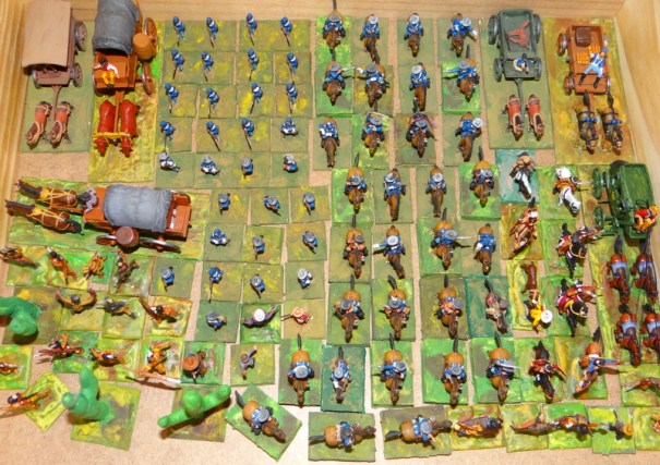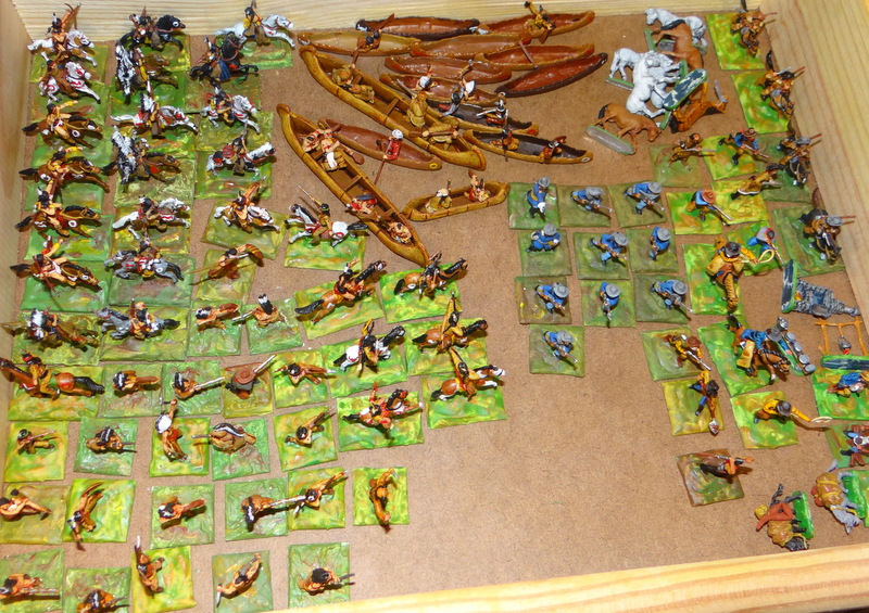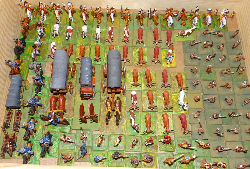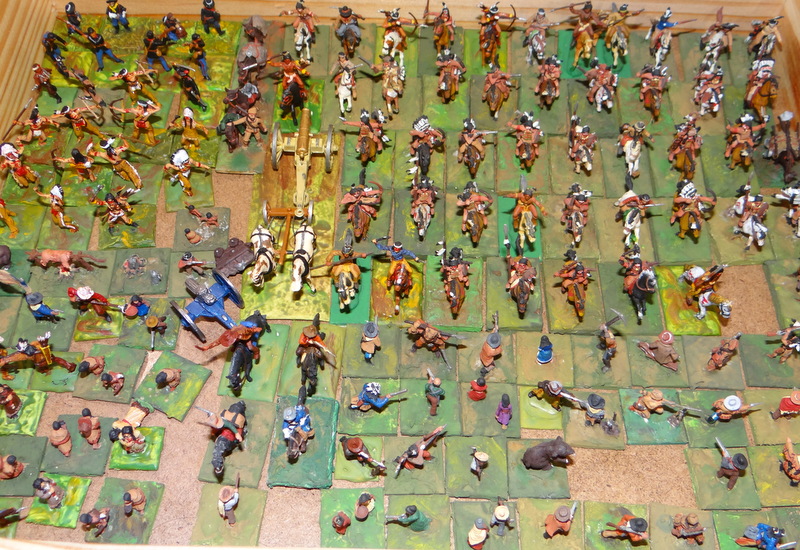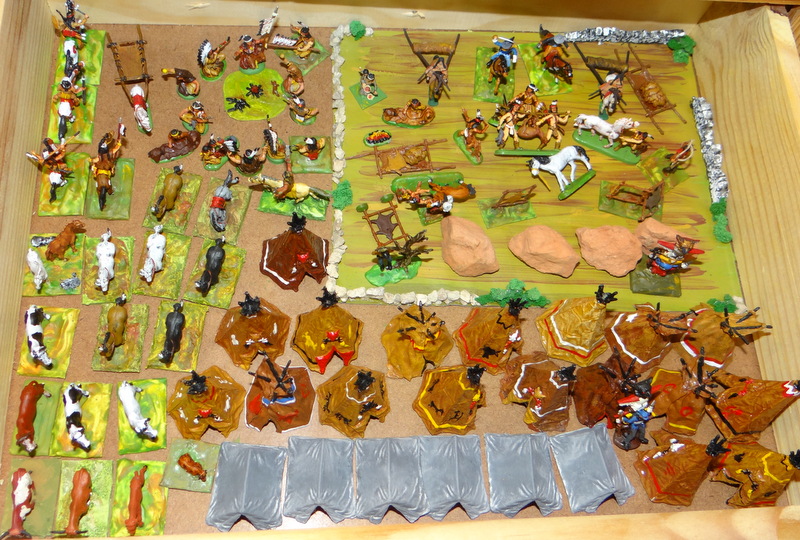 Je rappelle qu’on peut jouer seul à Pony wars car le parti des « méchants », les indiens en l’occurrence, est piloté par la règle. Voyons ce que j’ai dans mes tiroirs ou toutes les marques se côtoient : Minifigs, ATlantic, irregular, peter pig, old glory, airfix et j’en oublie.