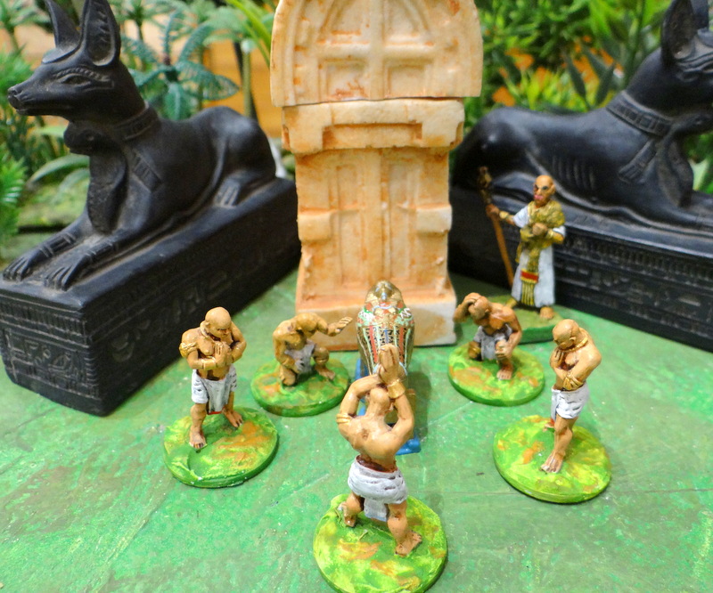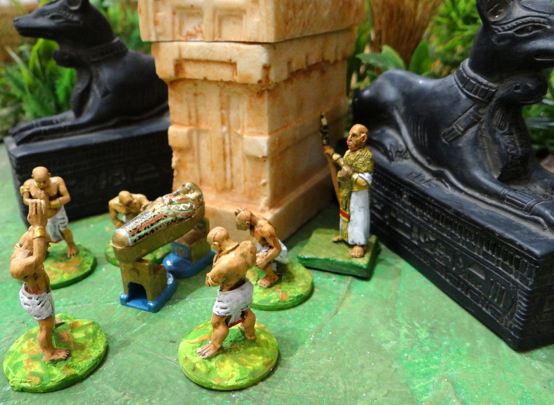 J’avais ces figurines Foundry depuis quelques années, il ne manquait plus que des socles. C’est chose faite ! Il s’agit d’une série de prêtres de Râ ou d’Anubis accompagnant un sarcophage.