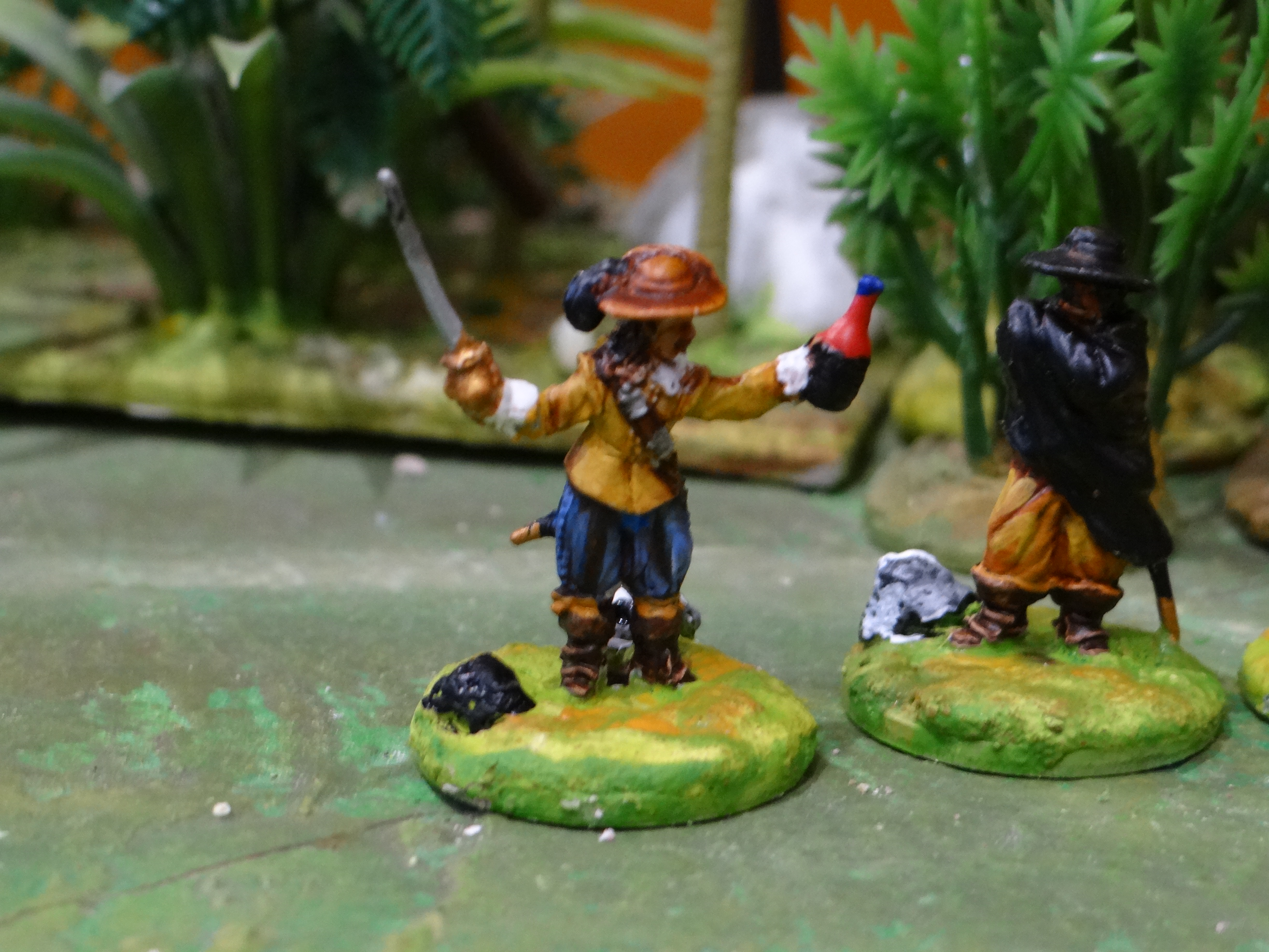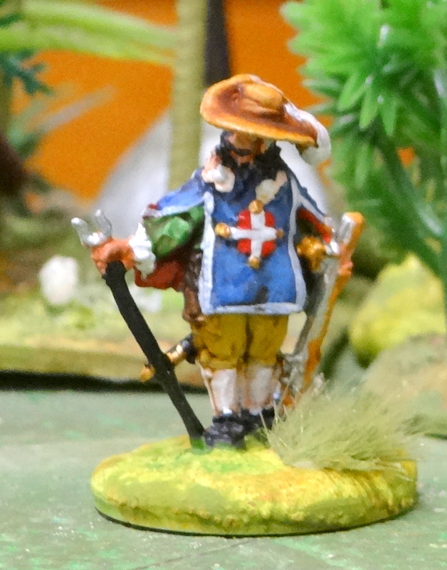 La figurine peut parfaitement représenter un mousquetaire en tenue civile narguant le sbire cardinalesque.