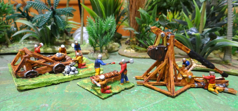 Voilà qu’arrivent 2 engins de siège de la guerre de cent ans en 15mm. Je poursuis donc la mise en couleur de mes impressions Eskice. A noter le bug d’impression de la catapulte avec les roues avant enfoncées dans la terre. j’ai voulu éditer la version bloc et les supports de la plaque de base étaient insuffisants ce qui à provoquer le décollement des coins qui se sont relevés. On apprend tous les jours. Pour le trébuchet je me suis abstenu d’imprimer la base. On ne le voit pas sur la photo mais les artilleurs ont tous les « fesses » à l’air, leurs pantalons se résumant à 2 jambes enfilées indépendamment. Il est possible que ce soit une erreur de ma part ( ma vue baisse), il s’agit peut être d’un collant porté en dessous. Il faut que je pose la question au concepteur !