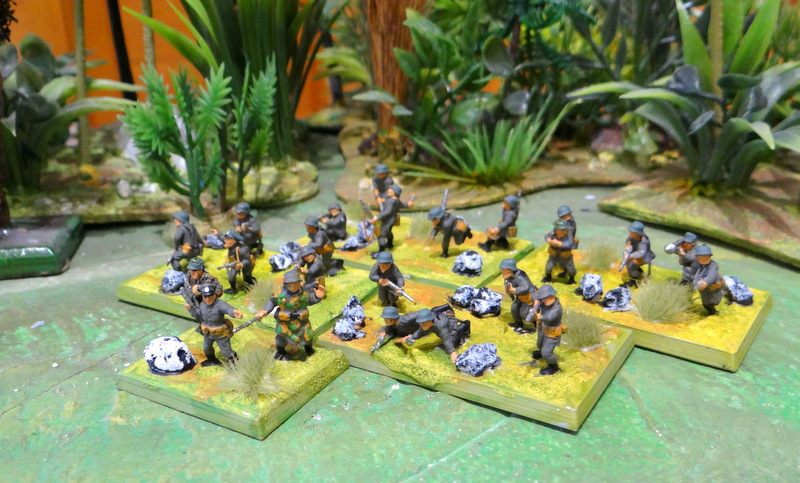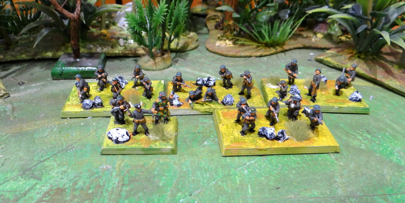 Premier équipe produite à partir de fichiers Eskice 28mm sauf une fig . Au vue des boutons des vareuses on voit nettement qu’il s’agit d’un groupe issue de la division « P’titedeutschland ». On peut qualifier le niveau de peinture de « pour wargames », les détails sont trop petits pour ma vue mais je pense que « ça peut le faire » pour une partie sur table. J’ai fabriqué les socles avec l’imprimante PLA.