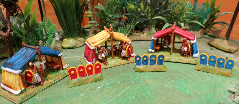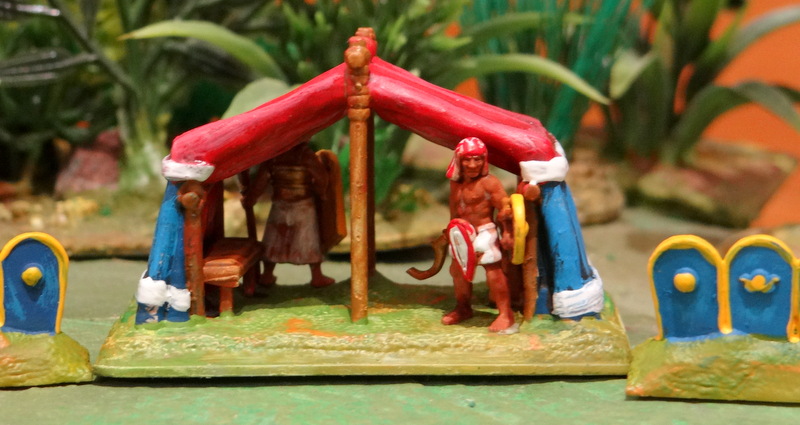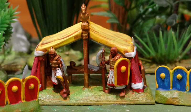 Un embryon de camp égyptien en 15mm. La tente du pharaon au centre est surmontée d’un Horus d’or. L’intérieur est plus élaboré avec une table centrale, des gobelets et une carte ainsi que des armes.