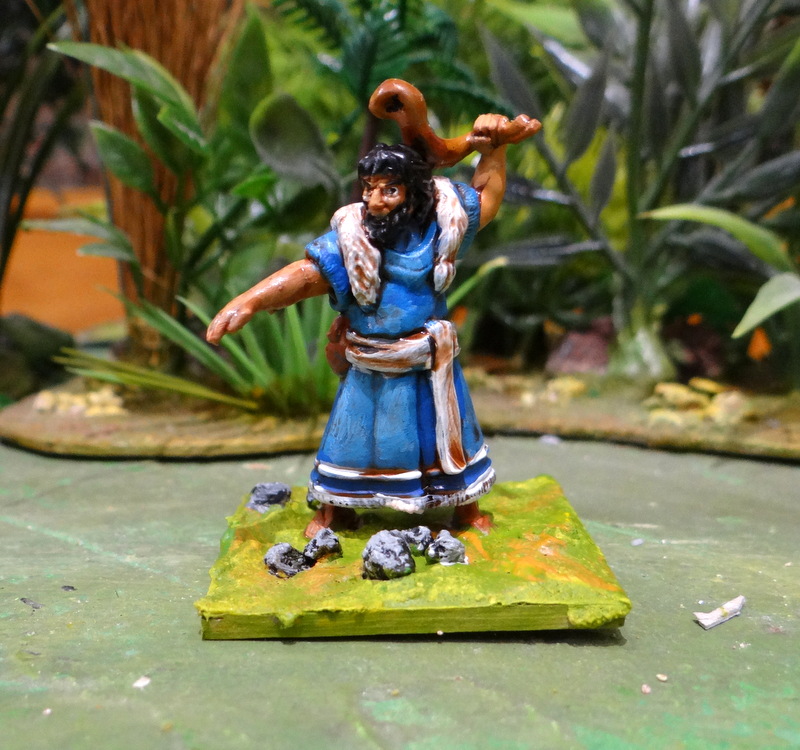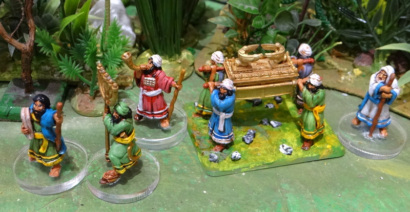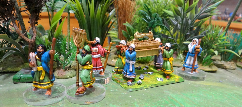Avec dans l’ordre : Moise et ses cahiers (qu’il n’a pas encore écrabouillés), 2 prêtres, le premier porte le « Memorah » à 7 branches symbole de la religion juive, l’autre sonne de la trompe « choffar ». Vient en fin l’arche (qui est vide, à priori, les tables de la lois étant dans les bras de Moise. Figurines imprimées à partir des fichier Red Cooper et destinée à équiper une armée hébreux en 25mm