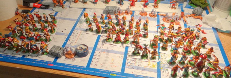 Grand ménage de printemps avec une opération soclage d’envergure. Près de 200 Aztèques 28mm arrivent sur la table de soclage. Je les socle sur une plaque de caoutchouc aimantée qui a l’avantage de pouvoir les regrouper sur une plaque métallique sans qu’ils tombent.