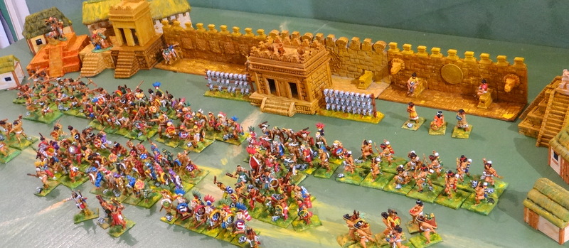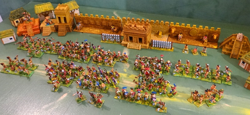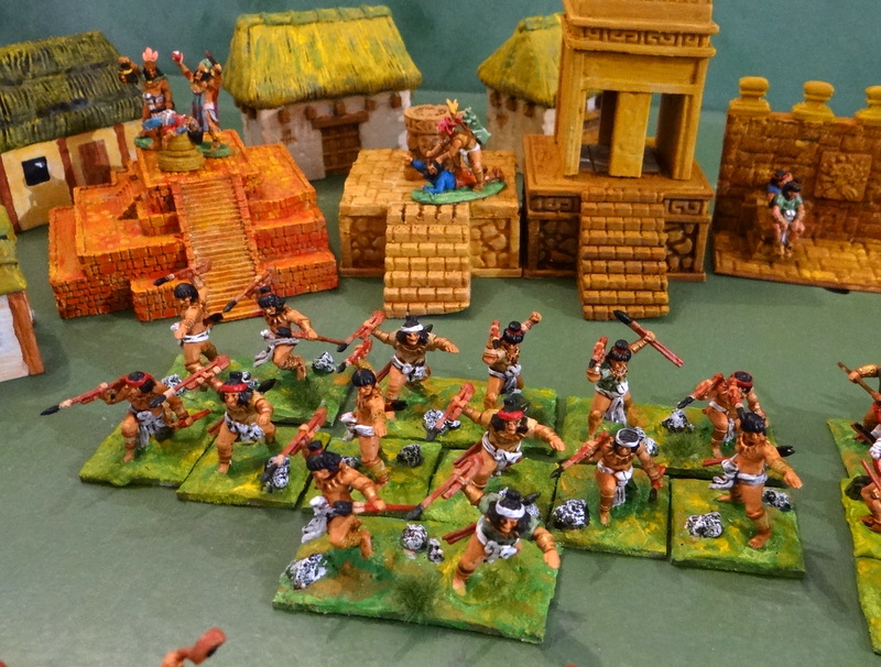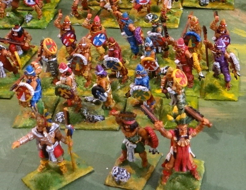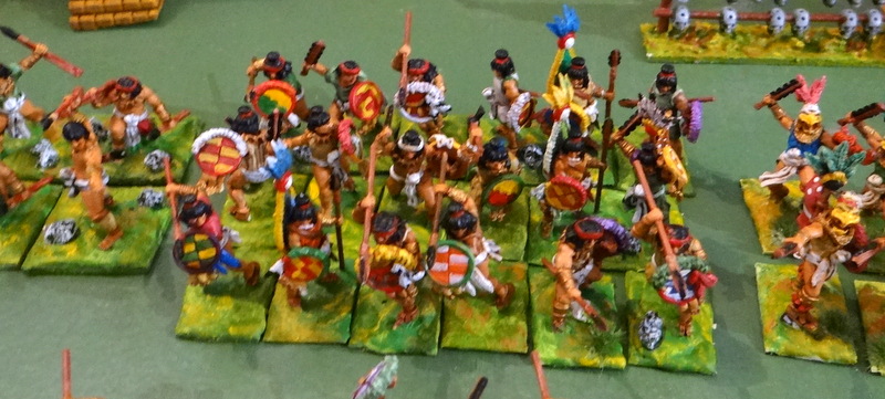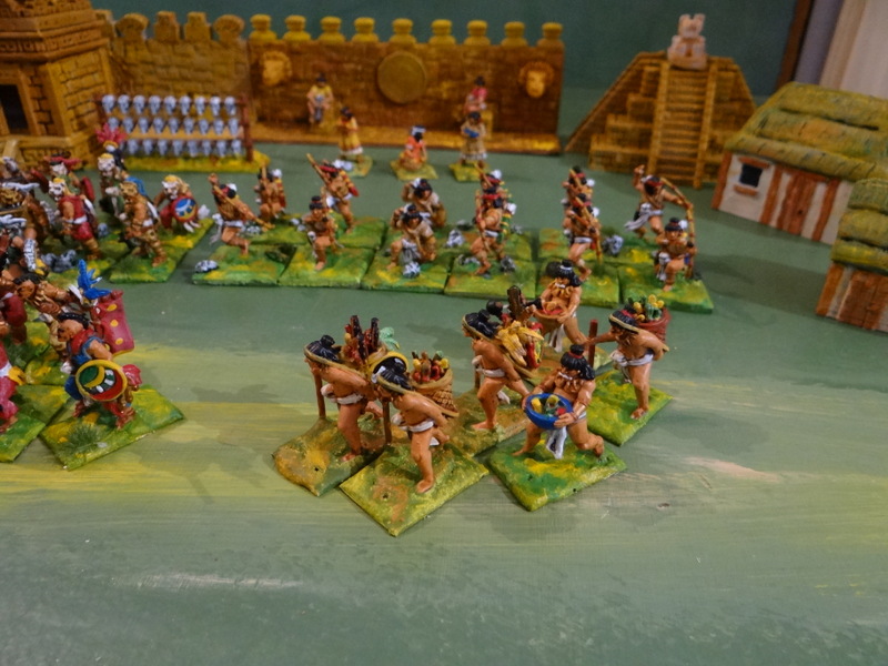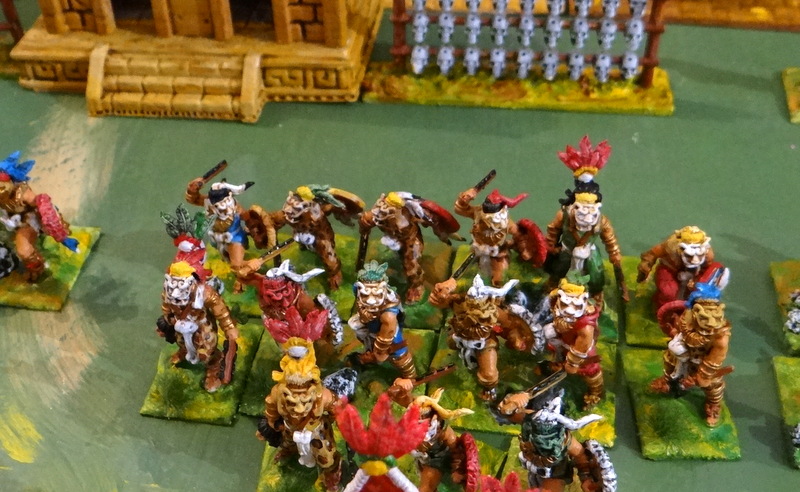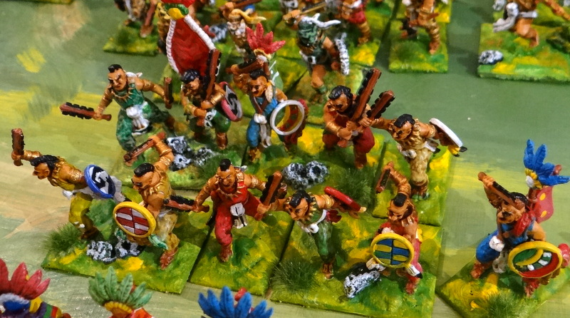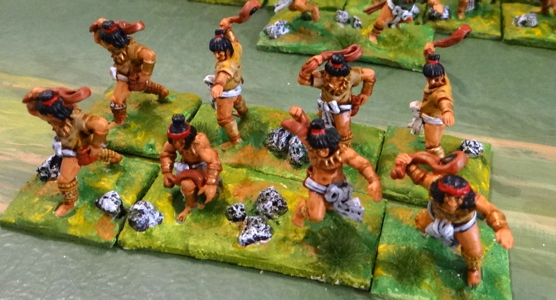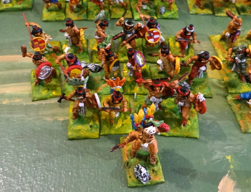 Et Oui, la marque OUTPOST n’existe plus, le gérant écossais a fermé son activité pour cause de maladie. Il semblerait que la gamme ait été reprise par « BADGER GAMES » ( jeux de blaireau en français). Je pense que c’est aux USA, ils vendent 7$25 le pack de 2 figs. Avec les frais de port ça doit douiller ! Je me suis donc rabattu sur Red Cooper et j’ai enfin trouvé le temps de socler un complément d’armée pour mes Aztèques 28 mm métal. Il m’a cependant fallu 3 après midi pour venir à bout des 150 figurines peintes depuis un an au moins mais que j’avais oubliées dans un tiroir.
