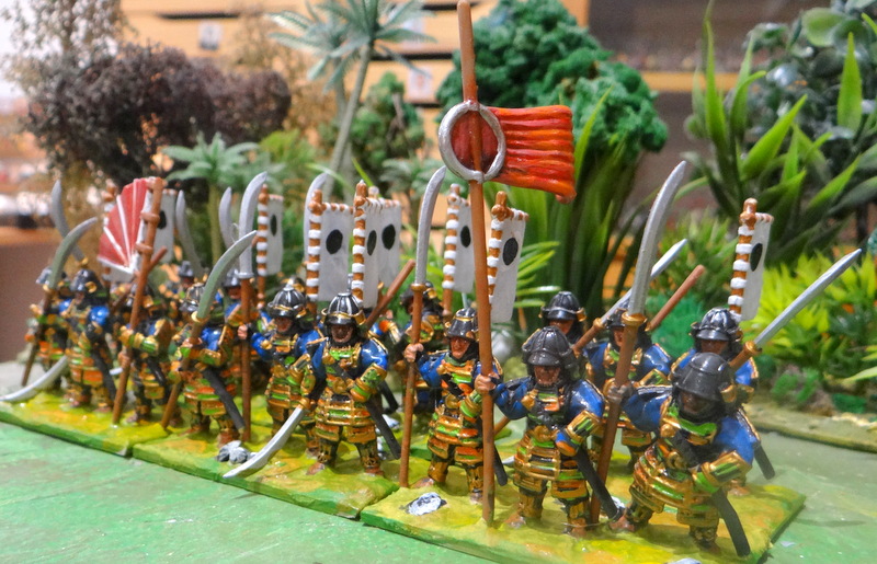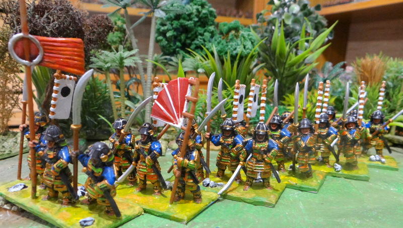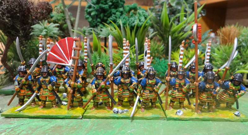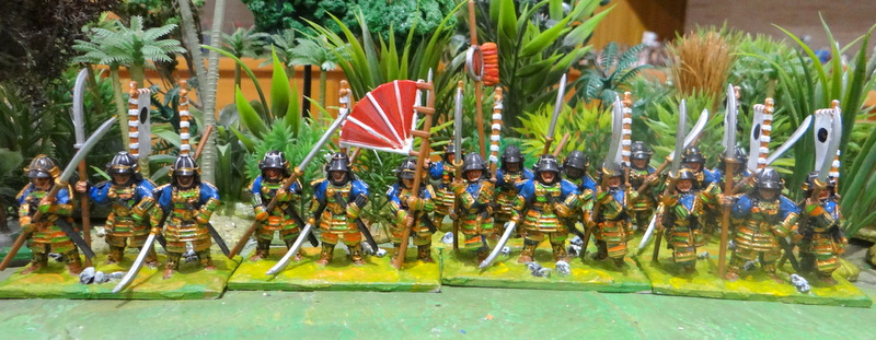 J’ai peint cette unité de naginatas aux couleurs du clan Takenata (je crois !). Vu la longueur de l’engin (entre 2m et 2m 40) je les ai soclés en LHI.