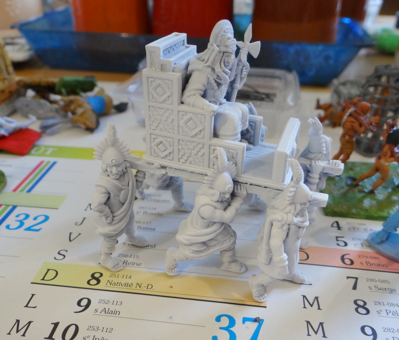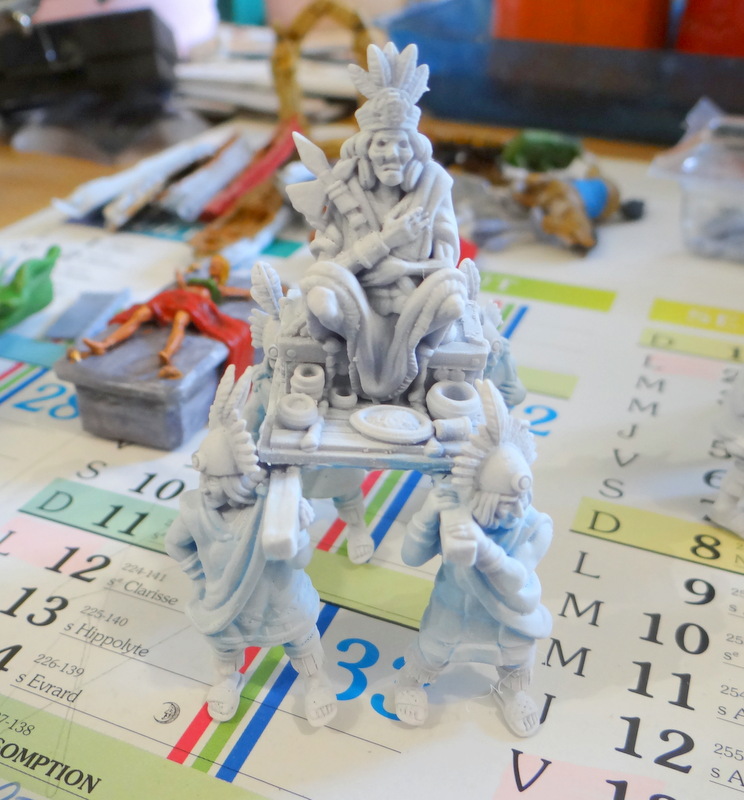 Prochaine mise en couleur : l’empereur Inca Atahualpa sur son trône. Figurine RedCooper. Impression toute récente.