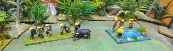 Deux nouvelles productions d ‘Eskice (un QG américain Vietnam et une série de GI Vietnam aussi) relance mes pinceaux sur une petite série imprimée il y a longtemps.. On retrouve une escouade de coolies chargés du ravitaillement ainsi qu’un groupe de villageois péchant dans un trou d’eau.