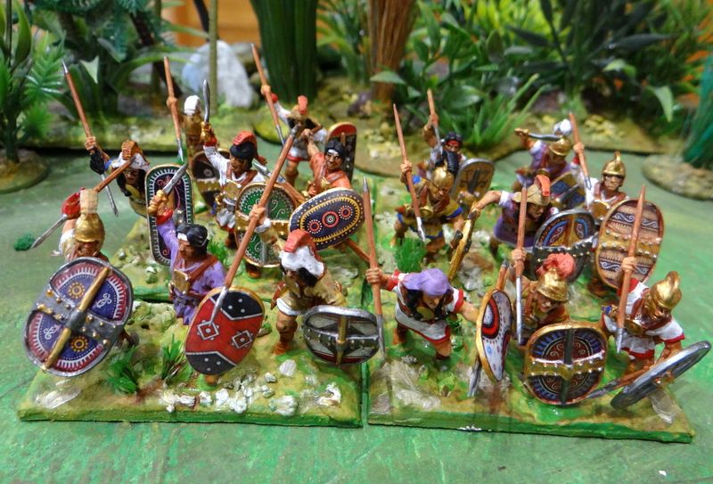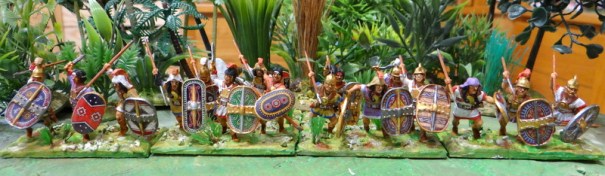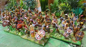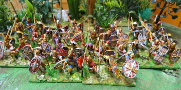 On disait en effet « Samnites » et non « Sanmites » ce qui aurait été une aubaine pour les pulls mais pas pour les Romains. Les Samnites peuplades montagnarde du centre de l’Italie étaient la bête noire de la Rome débutante laquelle leur doit l’humiliation des « fourches caudines » en 321 avant JC et ne l’oubliera pas puisque elle détruira totalement ce peuple au final. Ce qui m’intéresse pour l’instant c’est le ralliement des Samnites à Hannibal d’où le petit contingent que je m’apprête à mettre en ligne. j’ai choisi des 28mm Victrix sans armure sachant qu’en fait d’armures, ils portaient des disques pectoraux et dorsaux constitués le plus souvent d’un triangle de 3 disques. La tenue devait être à la mode étant donné qu’elle ressemble furieusement à celle portée par les Ibères (vus précédemment)