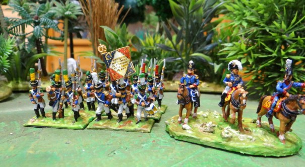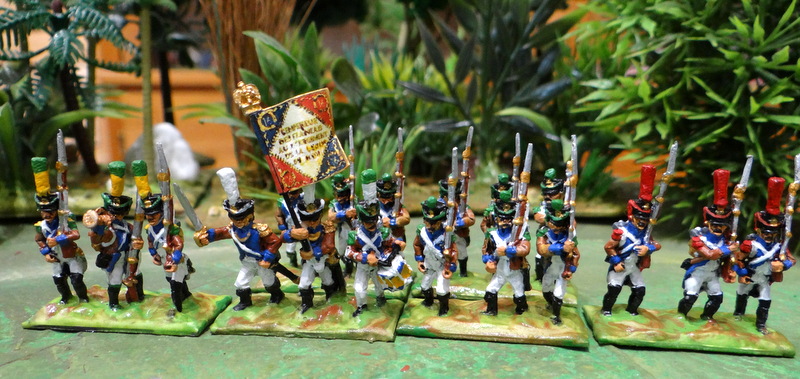 L’uniforme rappelle bigrement le 2éme régiment suisse. Mix de figurines « old glory » (figurines aux postions parfois bizarres et aux détails pas nets) et d’une marque espagnole.
